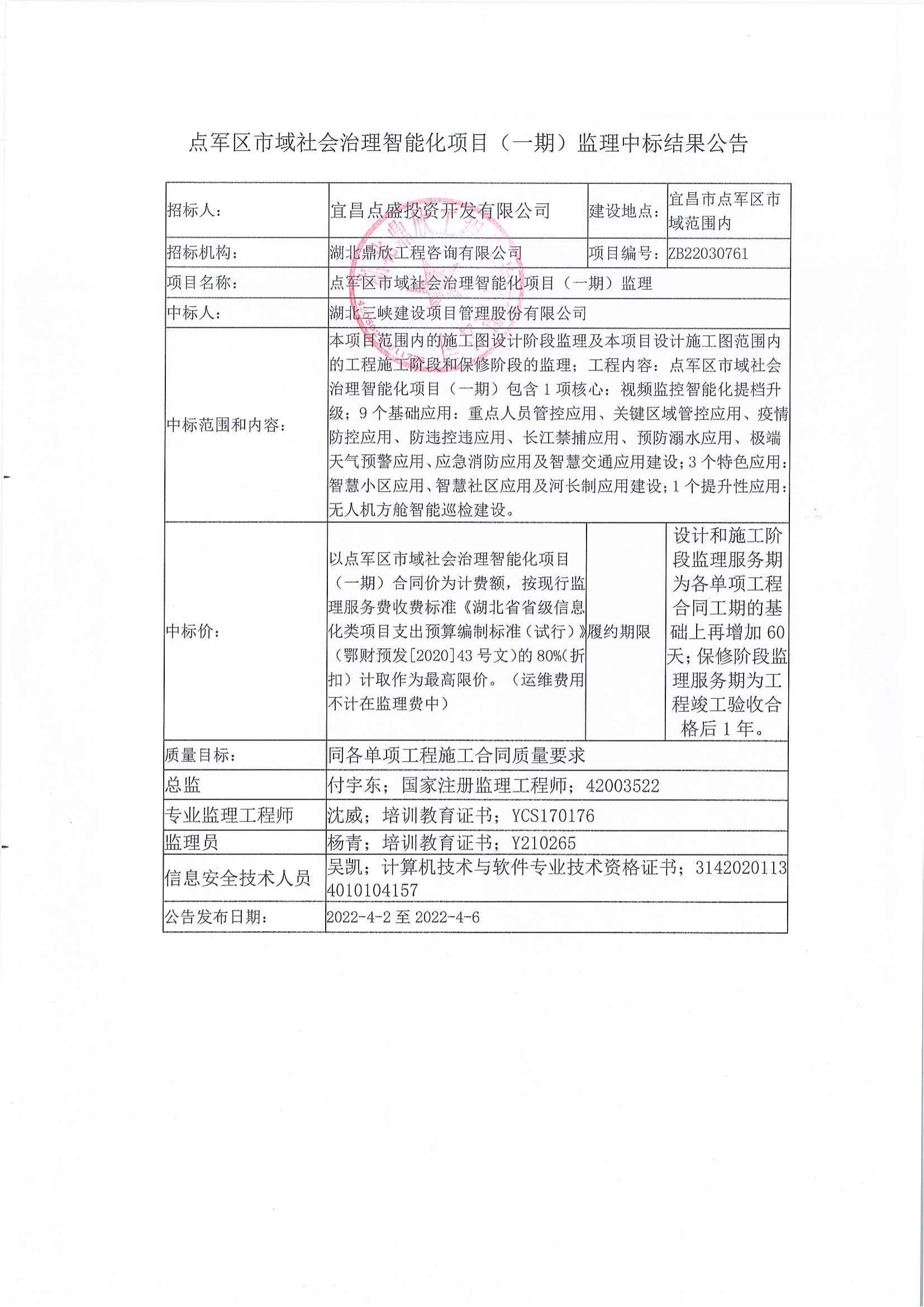點軍區(qū)市域社會治理智能化項目(一期)?監(jiān)理中標結(jié)果公告
