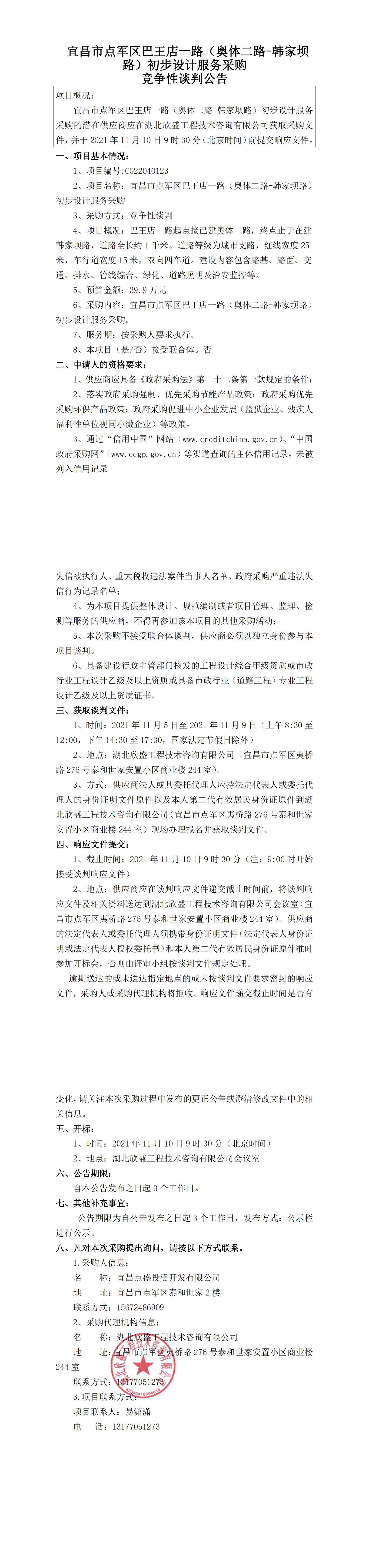 宜昌市點軍區(qū)巴王店一路(奧體二路-韓家壩路)初步設計服務采購競爭性談判公告