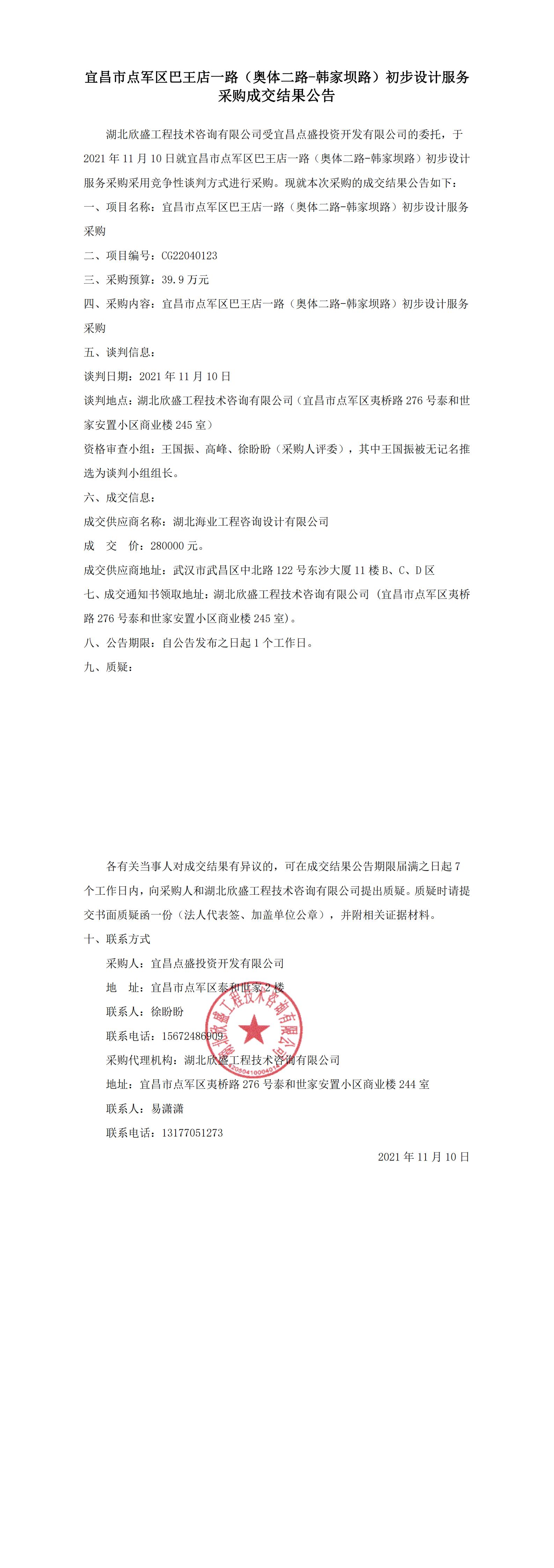 宜昌市點軍區(qū)巴王店一路(奧體二路-韓家壩路)初步設(shè)計服務(wù)采購成交結(jié)果公告