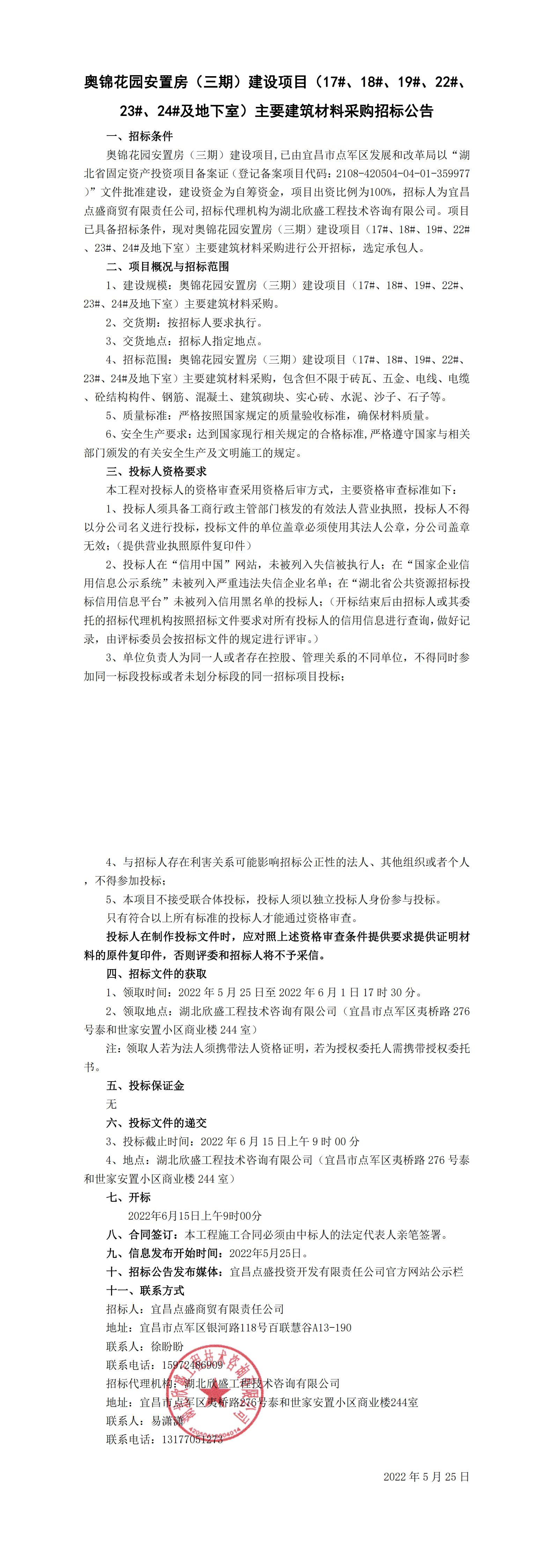 宜昌點(diǎn)盛商貿(mào)有限責(zé)任公司關(guān)于對奧錦花園安置房(三期)建設(shè)項目(17#、18#、19#、22#、23#、24#及地下室)主要建筑材料的采購公告