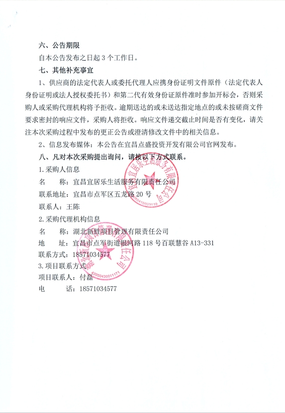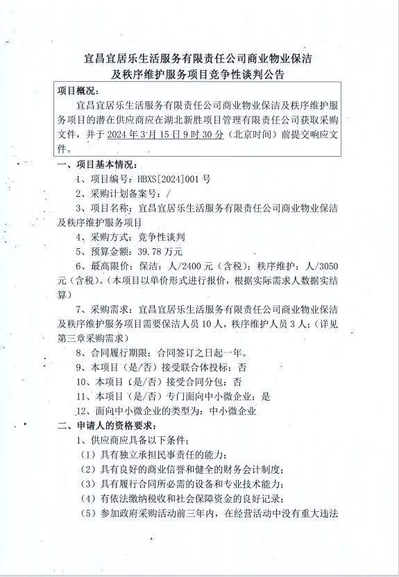 宜昌宜居樂生活服務有限責任公司商業(yè)物業(yè)保潔及秩序維護服務項目競爭性談判公告