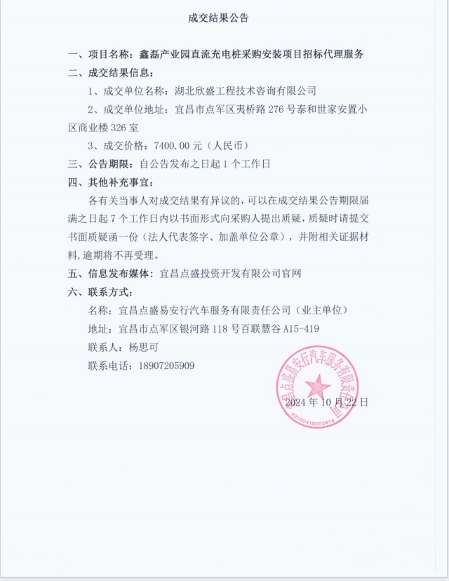鑫磊產業(yè)園直流充電樁采購安裝項目招標代理服務成交公告