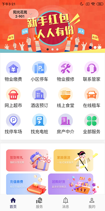 包括物業(yè)繳費、小區(qū)停車、物業(yè)報修、意見反饋、樓棟管家、賬單查詢、訪客邀請、家政清潔、養(yǎng)老護理、寵物代養(yǎng)等功能。